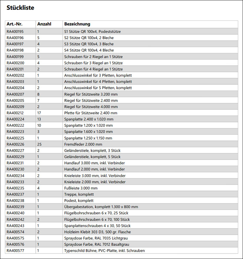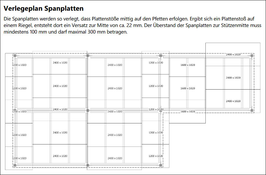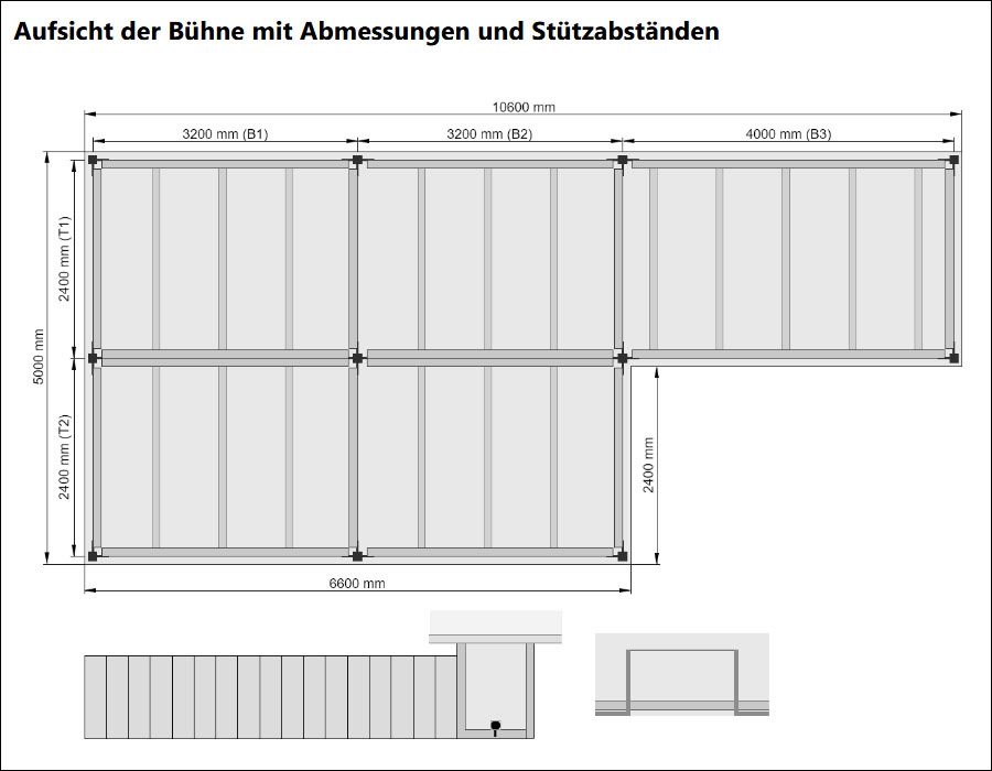 Die Aufbauanleitung der Lagerbühne wird durch die automatisch erstellten Zeichnungen und den individuell generierten Verlegeplan des Bühnenbelags ergänzt.