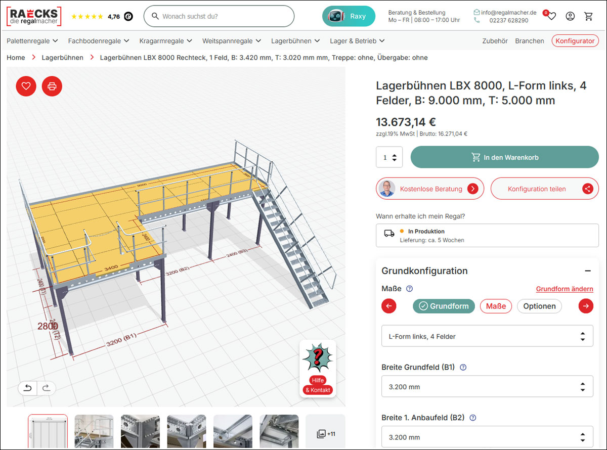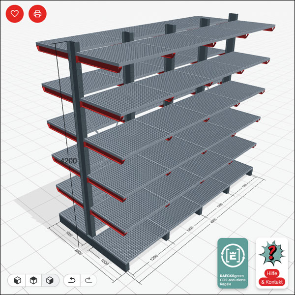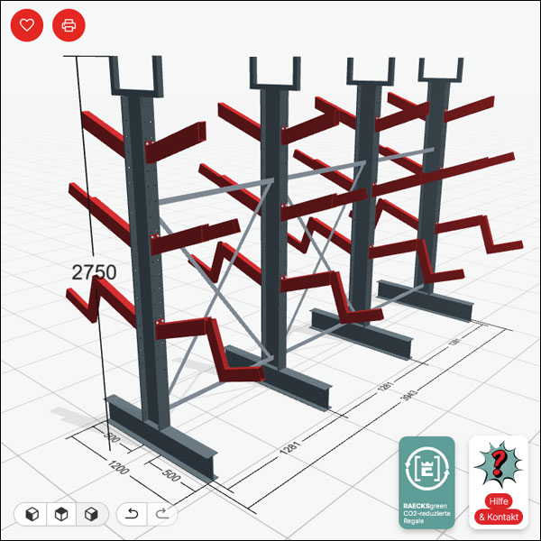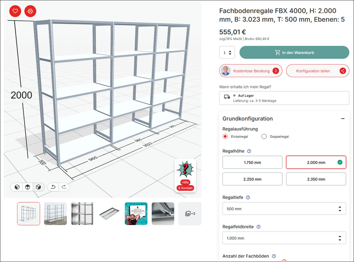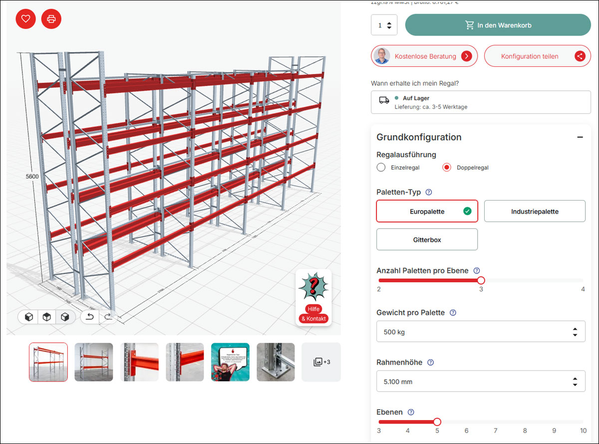 Unterschiedliche Regal- und Lagersysteme können auf vielfältige Weise konfiguriert werden. In Echzeit wird die 3D-Visualisierung generiert und die Einzelteil-Stückliste erstellt.
